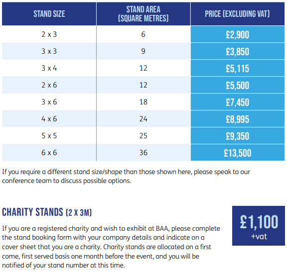 We encourage all exhibitors to carefully read BAA’s Privacy Policy here. Please note that in the case of shell-scheme stands, BAA might need to communicate your details to the exhibition services company in order to ensure smooth delivery of exhibition services.